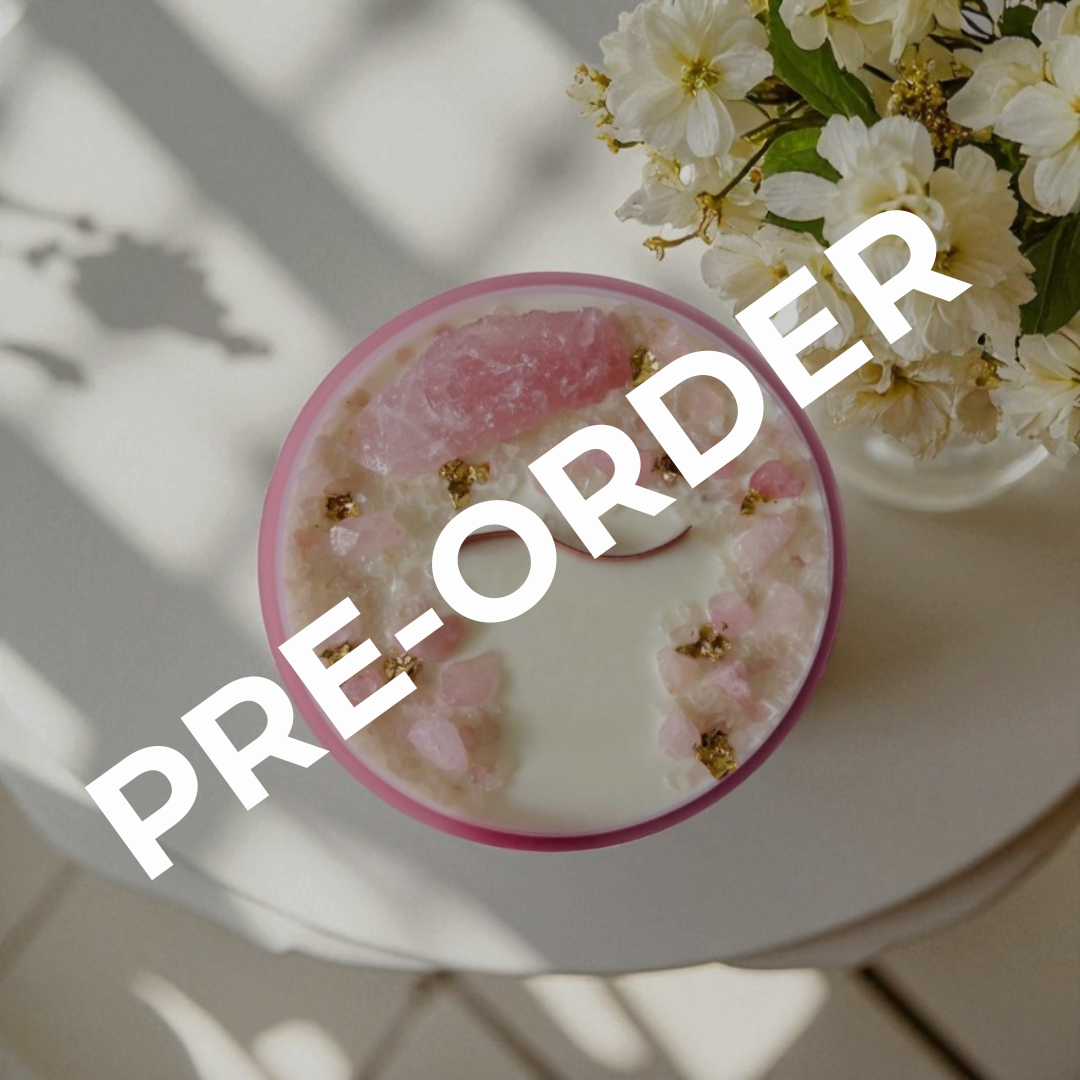 Hand-poured into artisan-made pink glass and adorned with gold flecks, each candle is filled with 1.7kg of coconut soy wax and embedded with Rose Quartz crystals — including a large, rough-cut crystal to keep long after the candle has finished burning.