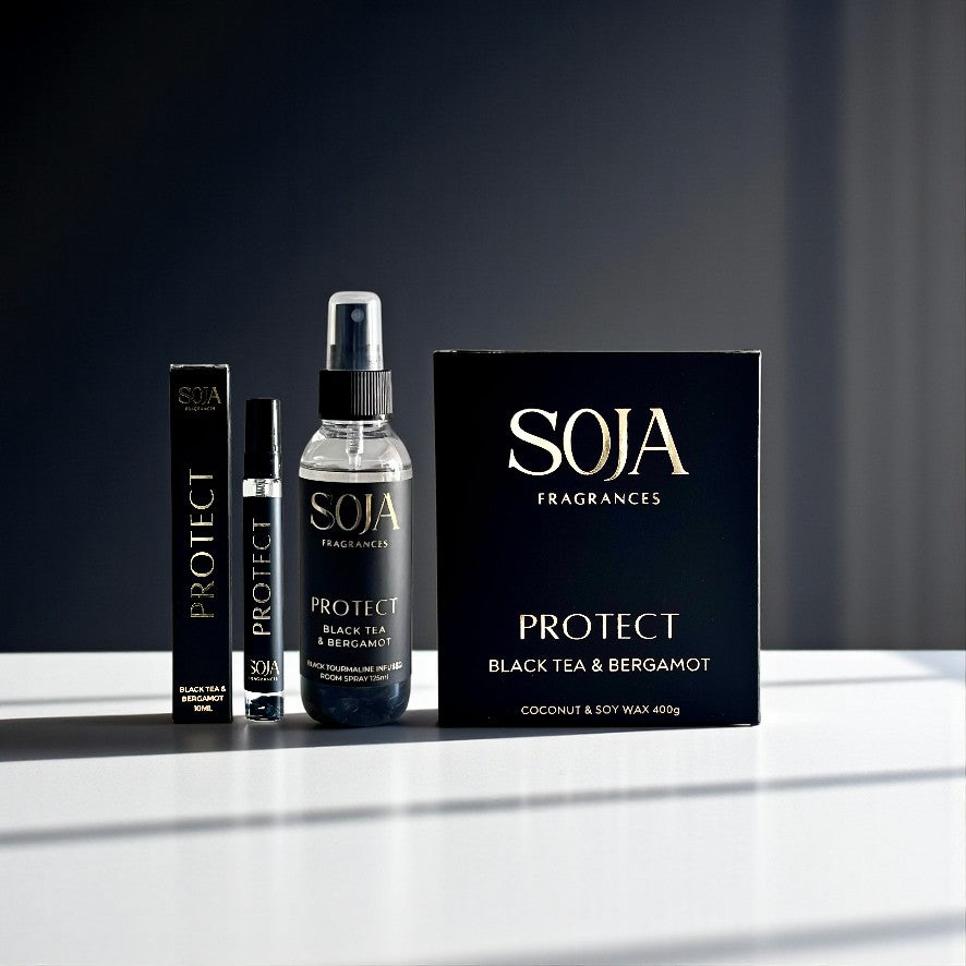Create a clear and grounded space with Protect — a bold, refreshing blend of Black Tea & Bergamot, paired with the protective energy of Black Tourmaline.